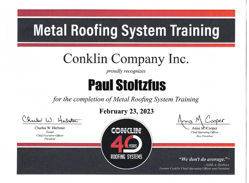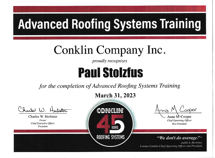 Owner Paul has earned the following professional certifications through Conklin, reflecting our dedication to advanced roofing knowledge and industry-leading installation standards: